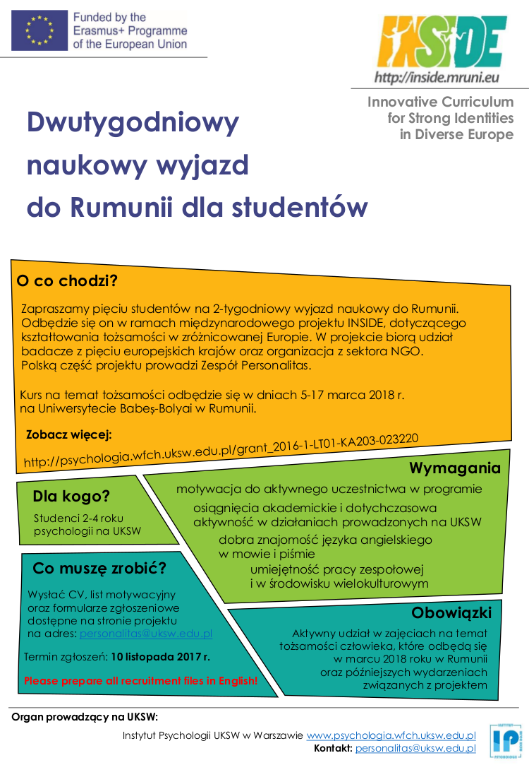 UKSW jest partnerem w projekcie ERASMUS+ Innovative Curriculum for Strong Identities in Diverse Europe (INSIDE). Celem projektu jest poszerzenie wiedzy na temat tożsamości osobowej i stworzenie nowych narzędzi wspierania młodych osób w realizacji zadań związanych z tożsamością. W projekcie biorą udział badacze z pięciu europejskich krajów oraz organizacja z sektora NGO.